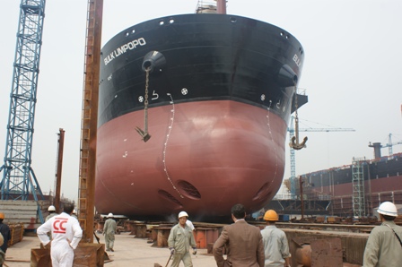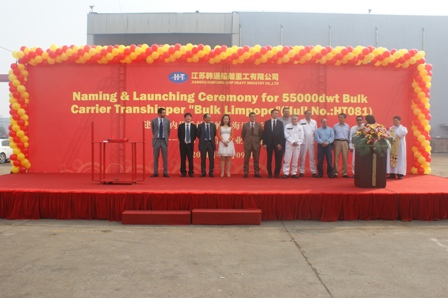 我司為意大利船東COECLERICI集團(tuán)建造的55000噸自卸散貨船(船體號HT081)于2011年6月9日在我司3#船臺舉行命名及下水儀式,該船入意大利船級社,被命名為“BULK LIMPOPO”,代理公司為蘇美達(dá)貿(mào)易公司。HT081為該項(xiàng)目系列船中的第2條。陳林軍常務(wù)副總,陳興副總,船東代表及船級社代表參加該儀式。